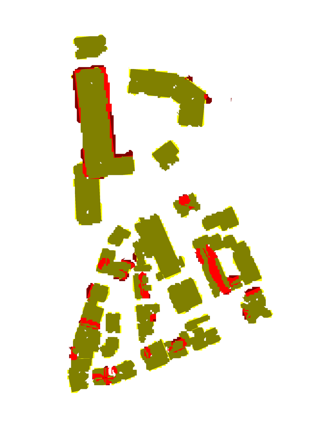 Pixels that belong to a detected roof plane found to have sufficient overlap with planes in the reference but that are not inside a building in the reference (because the extent of the detected roof plane is somewhat larger than the extent of the reference roof plane)