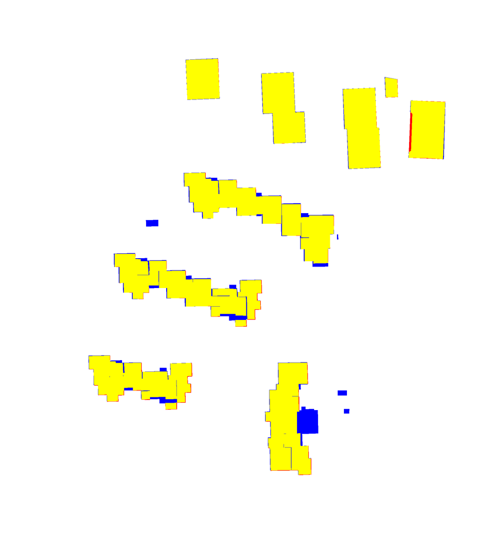 Pixels that belong to a detected roof plane found to have sufficient overlap with planes in the reference but that are not inside a building in the reference (because the extent of the detected roof plane is somewhat larger than the extent of the reference roof plane)